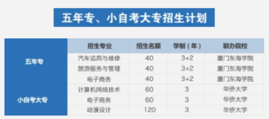 学校积极与高校开展联合办学,与厦门东海学院统招3+2大专,前三年在我校就读,后两年在厦门东海学院就读,录取纳入高校的招生计划,不必再入学考试,直接上大学;与华侨大学开办小自考应用型大专班,在校三年完成中专+大专+技能。