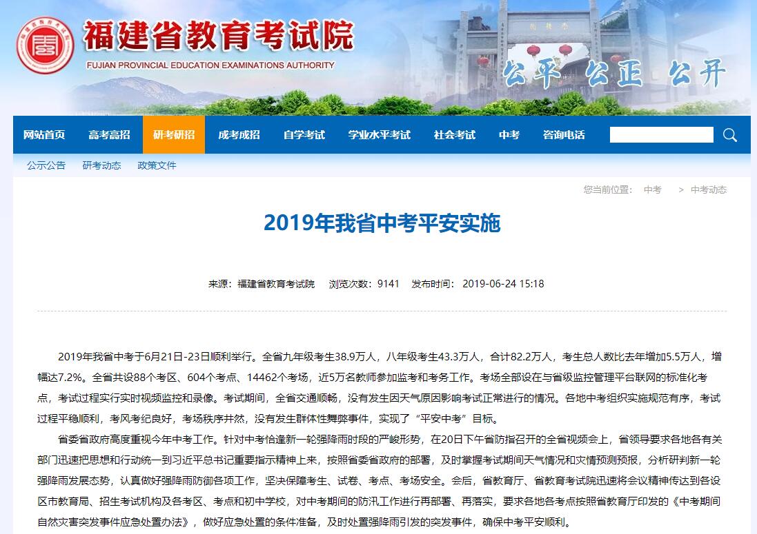 2019年福建省中考于6月21日-23日顺利举行。全省九年级考生38.9万人,八年级考生43.3万人,合计82.2万人,考生总人数比去年增加5.5万人,增幅达7.2%。全省共设88个考区、604个考点、14462个考场,近5万名教师参加监考和考务工作。考场全部设在与省级监控管理平台联网的标准化考点,考试过程实行实时视频监控和录像。考试期间,全省交通顺畅,没有发生因天气原因影响考试正常进行的情况。各地中考组织实施规范有序,考试过程平稳顺利,考风考纪良好,考场秩序井然,没有发生群体性舞弊事件,实现了“平安中考”目标。